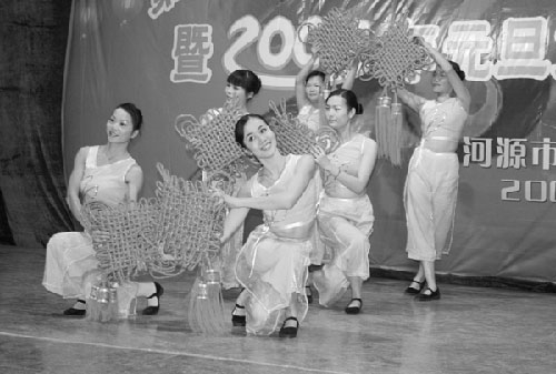 在2008年的鐘聲敲響之際,我市許多學校舉辦文藝活動,喜迎新年的到來。左圖為:在《同一首歌》的優美旋律中,河源中學校園文化科技藝術節暨2008年元旦文藝晚會拉開了序幕。合唱、舞蹈、口技、話劇、街舞、小品器樂等豐富多彩的節目,掀起晚會一浪浪高潮,充分展示了當今學生的藝術才華和張揚的個性。