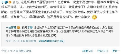 有網(wǎng)友在微博中向于娜發(fā)問:“您認(rèn)為在展示美和陷入炒作的誤區(qū)之間你會如何平衡,對那些批判你的人你想怎么回復(fù)他們?”于娜大方回應(yīng)網(wǎng)友:“在我看來這根本不值得一談,浪費大家的時間。事情很簡單,就是我穿了好友謝鋒老師的禮服參加活動,紅毯強(qiáng)光下讓原本看不出來的內(nèi)衣曝光了,完全沒有炒作,更沒有預(yù)先設(shè)計這樣的橋段。批判我的人?呵呵,請便啊,這不是我能控制的,我只會微笑。”