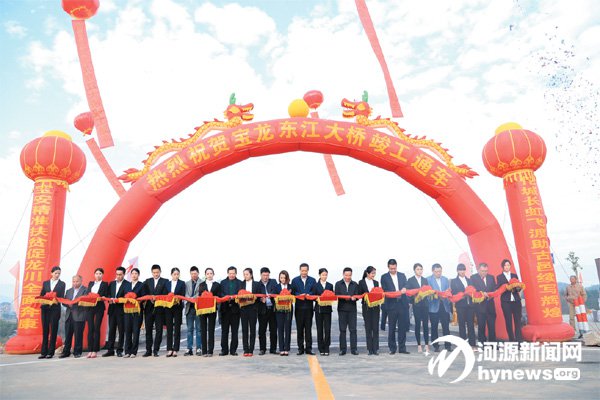 昨日上午,龍川縣寶龍東江大橋正式竣工通車。據悉,寶龍東江大橋是市、縣重點項目,該大橋橫跨佗城鎮東瑤和新度村,橋長885 米,寬12 米,大橋設計為雙車道。該橋投資6309 萬元,其中寶安區委區政府及交通、民政、慈善總會等部門發動寶安區企業家幫扶2000 萬元用于大橋建設。