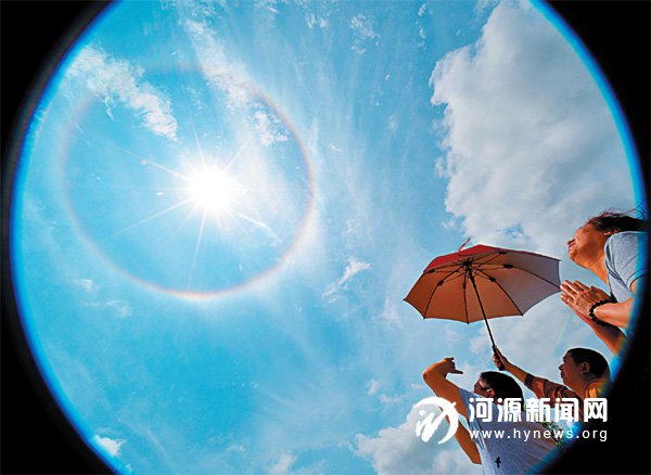 昨日上午11 時(shí)20 分許,連平縣忠信鎮(zhèn)上空出現(xiàn)日暈奇觀,幾道光環(huán)環(huán)繞太陽,甚是好看,吸引了不少群眾拍照留念。據(jù)了解,日暈是一種大氣光學(xué)現(xiàn)象,是日光通過卷層云時(shí),受到冰晶的折射或反射而形成的。由于蘊(yùn)含冰晶的卷層云一般是雷雨天氣入侵的“先鋒”,所以“日暈”的出現(xiàn)往往預(yù)示著不久后將有雷陣雨。