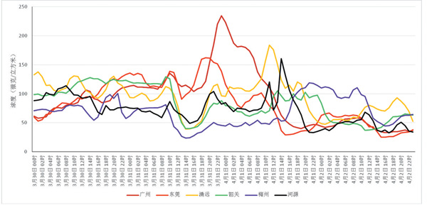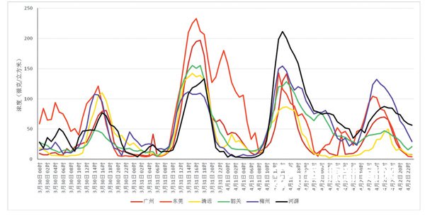 3 月30日至4月2日河源及周邊城市PM2.5 變化趨勢圖