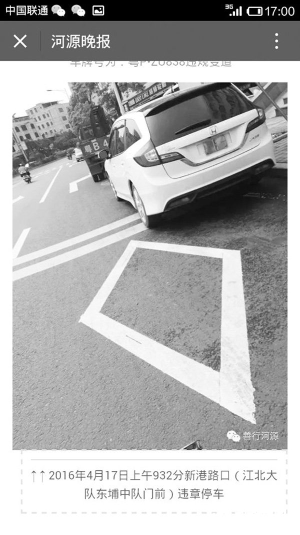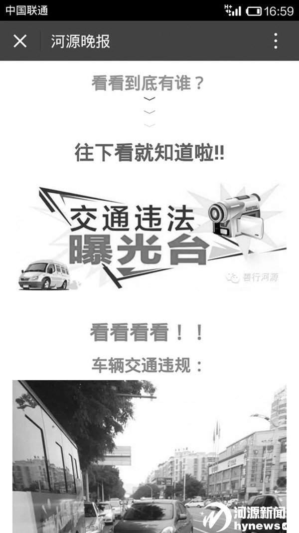 據了解,活動的第一個月(即4 月15 日-5 月15 日)為交通違規“不文明行為”的專項整治,活動官方微信平臺“善行河源”設立了“有你好看”欄目,共發布兩期交通違法專題,曝光了違規停車、違規變道等共30多張網友投稿圖片,《河源日報》、河源廣播電視臺、《河源晚報》3 家媒體也曝光了這組圖片。記者看到,照片均能清晰看到違規車輛的車牌,交警部門將會對“中招者”進行依法處理。接下來,活動還將邀請媒體走上街頭,現場曝光并采訪交通違規的行人及車輛,此外,活動還將對投稿圖片進行分類,陸續曝光行人交通違規、破壞環境、擾亂公共場所秩序等系列“不文明行為”圖片。