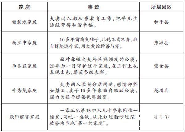 2016 年尋找“最美家庭”活動啟動后,廣東省上下聯動,依托婦女之家,面向城鄉家庭,活動豐富多彩。廣大家庭以持續高漲的熱情踴躍投身到活動中來,自薦他薦的家庭數有5000 多戶,一大批“最美家庭”優秀典型在活動中脫穎而出,夫妻和睦、孝老愛親、科學教子、勤儉持家、熱心公益、鄰里互助,在平凡的生活中書寫了一個個弘揚家庭美德、樹立良好家風的感人故事,以實際行動培育和踐行社會主義核心價值觀。經過層層篩選,省委宣傳部、省文明辦、省婦聯共選出100 戶家庭授予2016 廣東百戶“最美家庭”稱號,其中,我市賴慧濃家庭、楊立中家庭、李美容家庭、葉秀茂家庭、歐陽麗容家庭在列。市婦聯希望受表彰的“最美家庭”珍惜榮譽,再接再厲,用實際行動示范引領千萬家庭崇德守法、向善向美,希望廣大婦女和家庭成員向獲獎家庭學習,使家庭文明之花在河源大地競相綻放。