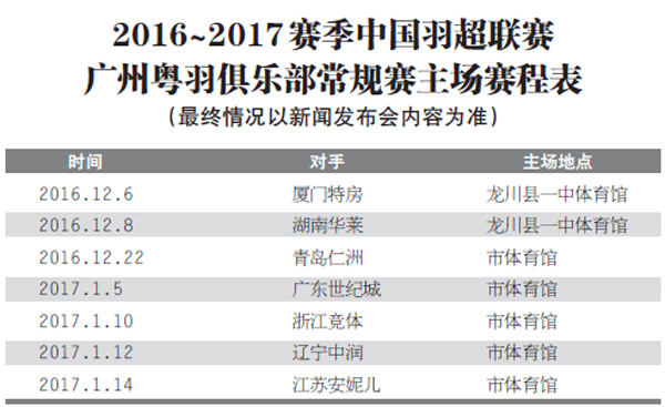 新一季中國羽超聯賽常規賽分兩循環開打,共有14輪比賽,廣州粵羽俱樂部將有 7個主場和7個客場要打。記者多方了解后得知,根據目前安排,廣州粵羽俱樂部12月 6日、12月8日的前兩個主場比賽將在龍川縣一中體育館進行,從12 月22 日的第3 個主場比賽開始,廣州粵羽俱樂部的主場將移到河源市體育館。