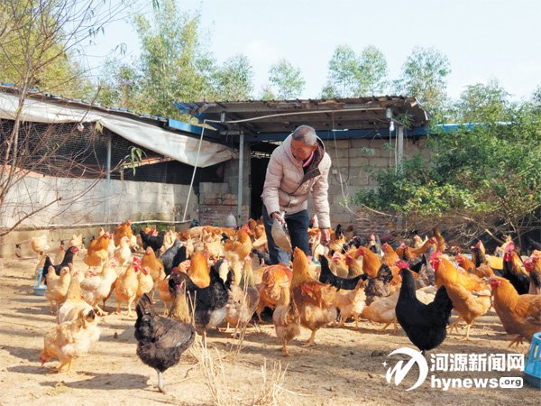 前日,冬日暖陽下,東源縣漳溪畬族鄉群星村吳貴林家的養雞場內,有的雞在山上奔跑,有的雞正懶洋洋地曬太陽,吳貴林拿起雞食,一勺勺舀到飯兜里,不需要叫喚,兩千多只雞就從山上奔下來,健步如飛。