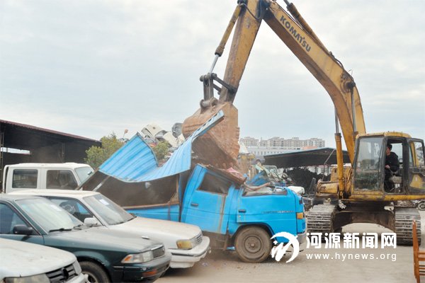 挖掘機的轟鳴聲響起,32 臺報廢車被銷毀。據(jù)了解,去年5 月份以來,市公安局開展異地用警交通違法行為專項整治行動,行動中查處各類違法行為3758 起,查處私家車14 臺、載客三輪車75 臺、超載超限車輛137 臺。昨日,市公安局對 32 臺報廢車進行了集中銷毀。圖為銷毀現(xiàn)場。
