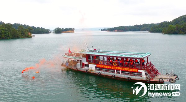 昨日,我市在萬綠湖新安碼頭成功舉行 水上突發事件應急聯合演練,演練以“強化救 助協作,共建平安河源”為主題,是自今年初 河源市水上搜救中心成立以來,首次開展的 高規格、大規模水上演練。演練內容模擬我 市受強對流天氣影響,萬綠湖轄區出現雷雨 大風天氣,陣風達8-9級,河源市水上搜救中 心立即發布預警信息和停航通知。載有17 名乘客、3 名船員的旅游船“萬綠339”在接到 信息后立即沖灘避風自救,在沖灘過程中發 現2名落水人員,船舶自用油泄露,疑有船舶 沉沒。水上搜救中心接到求救信息之后,迅 速救起落水人員并清理水上油污。