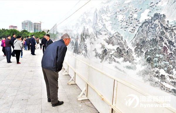 日前,由中國美協會員、國家一級美術師、著名畫家駱文冠創作的《東江百里圖》在龍川縣進行展覽。當天上午,來自深圳、惠州、河源、梅州等地的書畫愛好者在龍川縣文化廣場欣賞了《東江百里圖》。據悉,這幅長111 米,高1.2 米的長卷作品耗時近3 年,畫家以精湛的筆墨,描繪了東江沿岸的山水秀色。