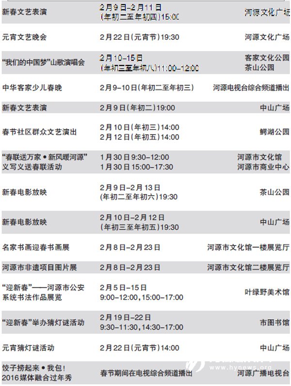 為了讓各縣區人民都能過個熱鬧的春節,春節期間,市文廣新局還組織了專業人員開展“我們的中國夢”——文化進萬家活動,深入到邊遠農村、廠礦、社區、敬老院及軍營等,為市民舉行義寫春聯、送戲下鄉、文藝演出、書法展覽、新春電影等新春活動。此外,各縣區文廣新局也組織了精彩紛呈的文藝演出活動,源城區民族音樂會、東源上莞新輪追龍文藝演出、和平歷史文物及專題記憶展、龍川文化惠民送戲下鄉巡回演出、紫金民間花朝戲演出、連平忠信吊燈習俗展示活動等具有當地特色文化活動也都將輪番上演。