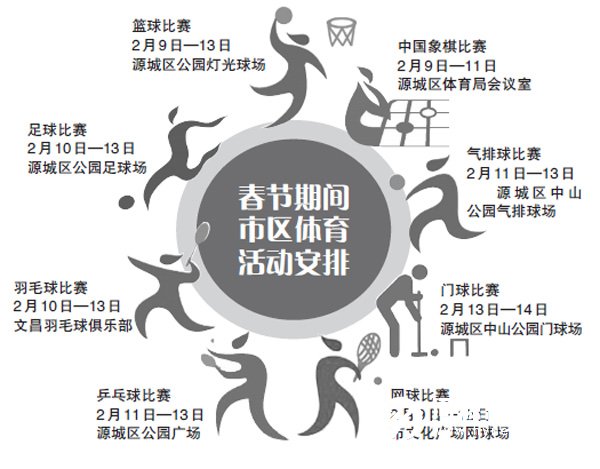 記者從市體育局獲悉,春節期間,各縣區組織了一系列豐富多彩的體育活動,務必要讓群眾在這個節日動起來、“熱”起來。以源城區為例,區體育局一連舉辦了籃球、足球、乒乓球等8 個類別的體育比賽,時間從2 月9 日持續到14 日。這些活動中,既有群眾基礎廣泛的球類比賽,也有中年市民喜歡的網球比賽,還有為老年人量身定制的門球、氣排球比賽。