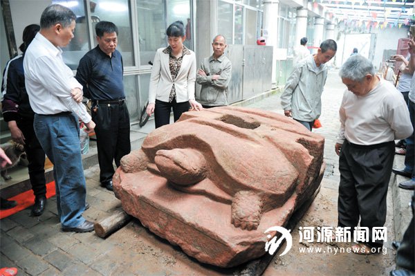 本報訊 記者 吳奕鎮(zhèn) 特約記者 劉偉東 18 日,龍川縣佗城南門碼頭工地上,施工人員挖出一只“大石龜”。經(jīng)專家初步鑒定,挖掘出來的“大石龜”其實是“赑屃”,形似龜,是明代文物。該赑屃整體完整,未受到破壞,長1.66米、寬1.33米、高0.68米,重約4噸,龜體刻有陰紋,由紅砂巖石雕刻而成,雕工精細,栩栩如生,龜體下面連接有石基座。