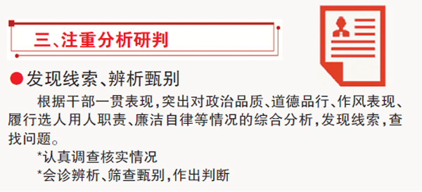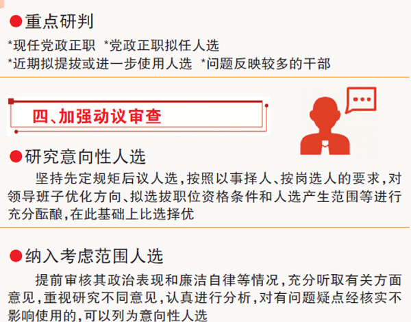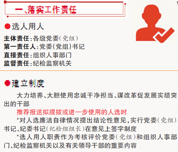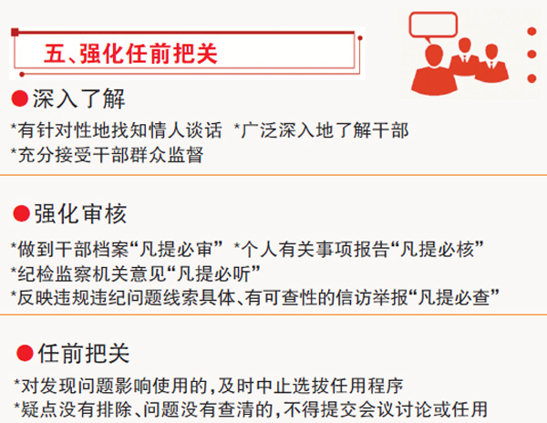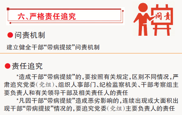 通知強調(diào),各級黨委(黨組)要把防止干部“帶病提拔”作為全面從嚴(yán)治黨、從嚴(yán)管理干部的重要內(nèi)容,體現(xiàn)到干部選拔任用工作全過程,嚴(yán)格履行主體責(zé)任,堅持原則,敢于負(fù)責(zé)。要突出重點,抓住“關(guān)鍵少數(shù)”,堅持人選標(biāo)準(zhǔn),嚴(yán)格履行程序,切實做好縣處級以上領(lǐng)導(dǎo)干部的選拔任用工作。要堅持事業(yè)為上、公道正派,保護作風(fēng)過硬、敢作敢為、銳意進(jìn)取的干部。要加強督促檢查,對貫徹《意見》不力的,嚴(yán)肅問責(zé)追責(zé)。各級組織人事部門和紀(jì)檢監(jiān)察機關(guān)要在黨委(黨組) 領(lǐng)導(dǎo)下,準(zhǔn)確領(lǐng)會《意見》的精神實質(zhì),正確把握政策界限,切實履職盡責(zé),加強溝通聯(lián)系,形成工作合力,把制度規(guī)定落到實處。在地方領(lǐng)導(dǎo)班子換屆工作中,要認(rèn)真貫徹執(zhí)行《意見》規(guī)定,堅決防止干部“帶病提拔”。