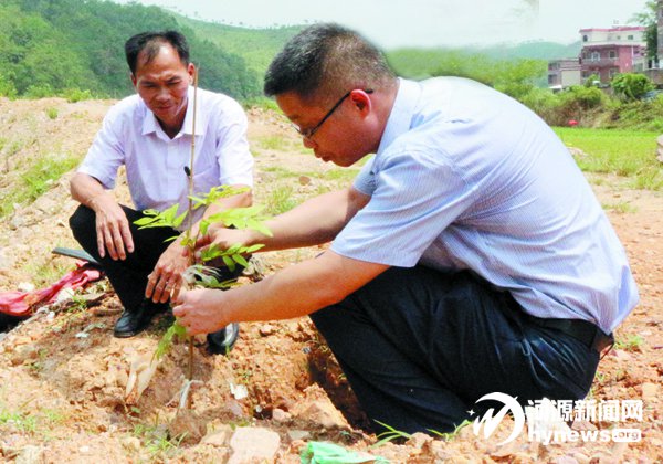 李永紅(右)仔細察看澄溪河邊花梨木長勢情況。