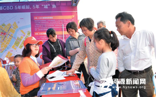眾多意向客戶(hù)在樓盤(pán)攤位前了解置業(yè)信息。
