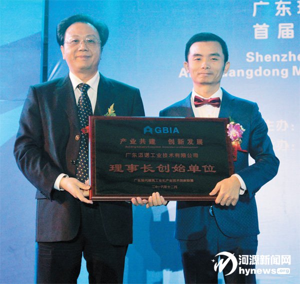 河源市委常委、副市長、深圳對口幫扶河源指揮部總指揮鐘蔭騰(圖左)為聯(lián)盟發(fā)起單位廣東邁諾工業(yè)技術(shù)有限公司授牌。