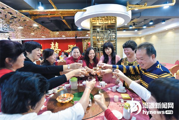 記者看到,此次客家喜宴多設傳統客家菜肴,釀豆腐、紅燒肉、客家娘酒等12 道客家風味食品依次上桌。“以前,在客家人艱難而又貧苦的遷移生活中,通過婚禮來一次聚餐,是最幸福的時刻。”“客家人講究‘無雞不成宴’,雞同吉諧音,這是追求吉祥的意思。”“婚宴上,新人要著紅裝、走紅毯、牽紅綢、踏繡球、拜天地高堂……”宴席過程中,主持人介紹著客家婚宴的各種菜肴及習俗。其實,“吃貨”文化只是客家婚宴的一個元素,客家婚宴最重要的是熱鬧,這一次,恩愛夫妻們互為賓客,互相祝福,熱鬧非凡。