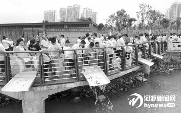 14 日,河源市釣魚協 會組織市民到市區東江灣 公園的東江河段開展魚苗 放流活動,上百名釣友和 市民紛紛用水桶盛裝魚 苗,從江岸把魚苗投放到 東江里。