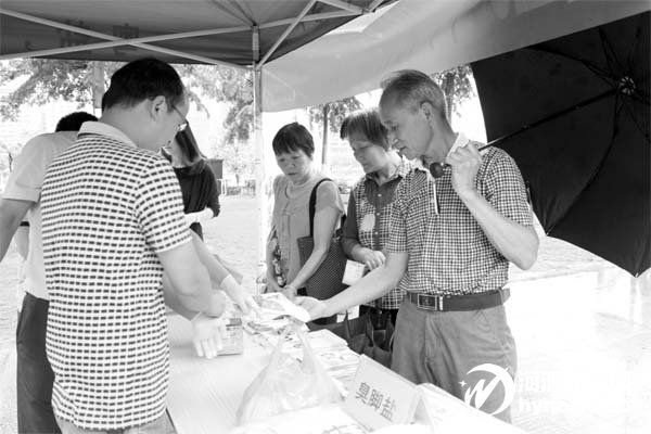 工作人員教市民如何識(shí)別放心鹽和“臭腳鹽”。