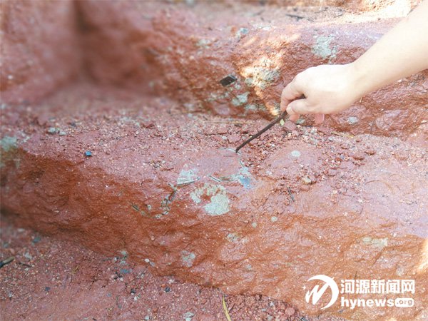 記者看到,外露的這窩恐龍蛋化石外殼表皮已在開鑿時被損傷,隨行的市國土局工作人員經過仔細甄別后表示,這的確是恐龍蛋化石,外露的一共有5 枚,破損得比較厲害,但是不排除在這窩外露的恐龍蛋化石下面,可能埋藏著數量更多的恐龍蛋化石。經工作人員測量,這窩“恐龍蛋”,約有5 枚呈窩狀外露,鑲嵌在一處鑿好的紅砂巖層便道上,平均個體直徑在10-12 厘米之間,均為圓形蛋。隨后,工作人員就開始聯系此處的業主和施工單位,實行搶救性保護,避免對化石造成二次損壞。