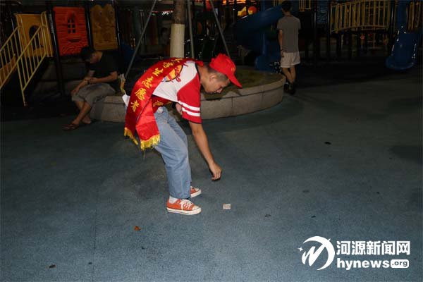 大學生志愿者夜晚仍在值班,拾撿地上的垃圾。