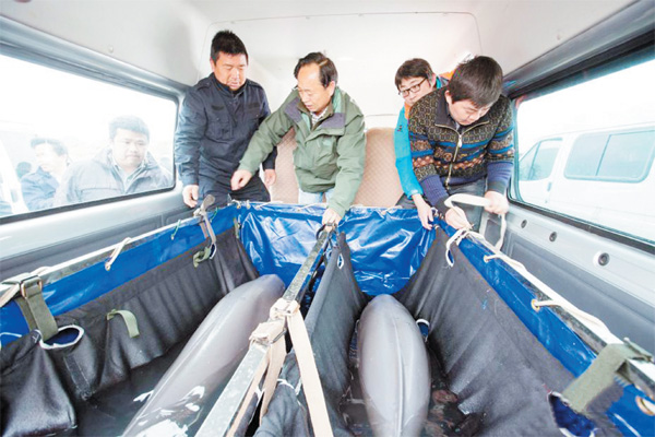 前日,在鄱陽湖江西都昌城西碼頭江豚暫養點,工作人員在網捕江豚,準備外遷到位于湘鄂兩省交界的長江何王廟(集成垸)江豚保護區。據介紹,鄱陽湖由于水質優良、環境穩定,共有450 余頭江豚棲息,約占江豚總數的一半。為了加強江豚的保護,3 月15 日農業部啟動長江江豚拯救行動計劃2017 年遷地保護項目,截至3 月22 日,行動隊在都昌港附近共起水江豚32 頭,其中12 頭被放入網箱暫養,20 頭被安全釋放回湖中。