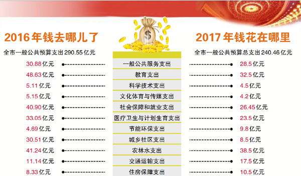 根據(jù)市委、市政府確定的全市經(jīng)濟(jì)發(fā)展目標(biāo),2017年全市財(cái)政一般公共預(yù)算收入總量為240.46億元。按照“量入為出,收支平衡”的原則,全市一般公共預(yù)算總支出安排240.46億元。