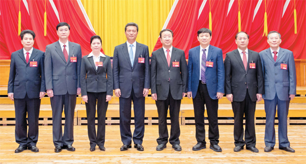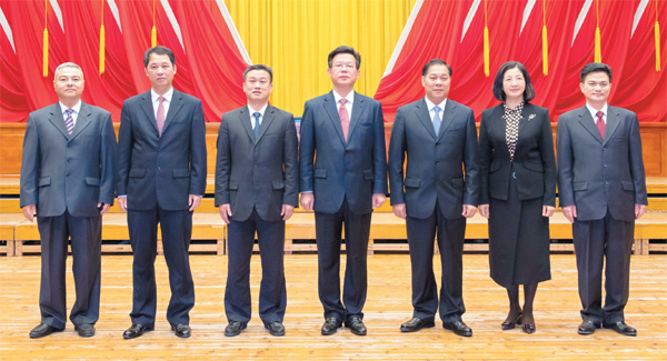 彭建文(左四)當選市人民政府市長,黎意勇(右三)、謝耀琪(左三)、朱蔚蔚(右二)、葉少軍(左二)、范秀燎(右一)、龐啟彪(左一)當選為副市長。
