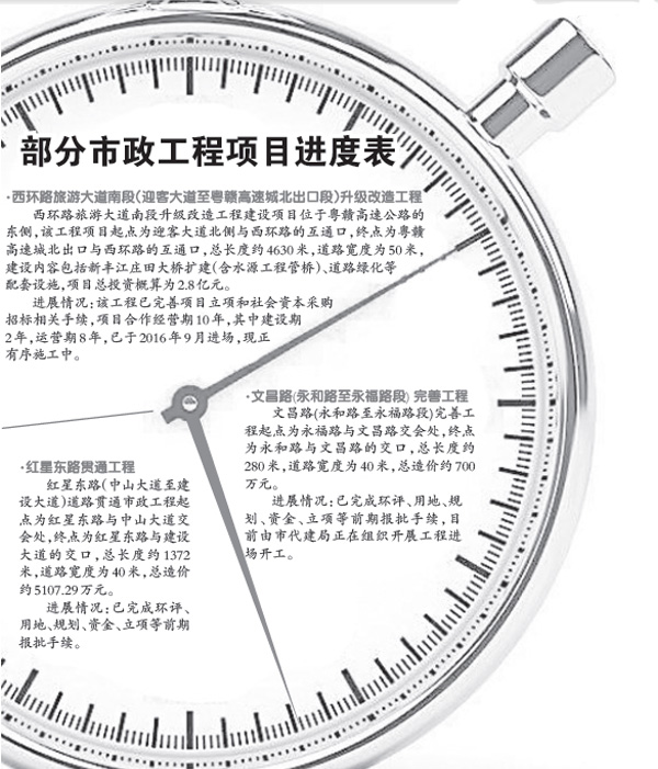 據了解,今年我市將對文明路、長安街、新風路(文明路至永福路)、大同路北(紅星路至永和路)、小江橋橋頭交通節點、文昌路(永福路至永和路段)、紅星東路(文昌路至建設大道段)、福新北路(越王大道至東江西路段) 道路進行升級改造。前日,記者從市住建局、代建局了解到部分項目概況及進度,具體如圖。