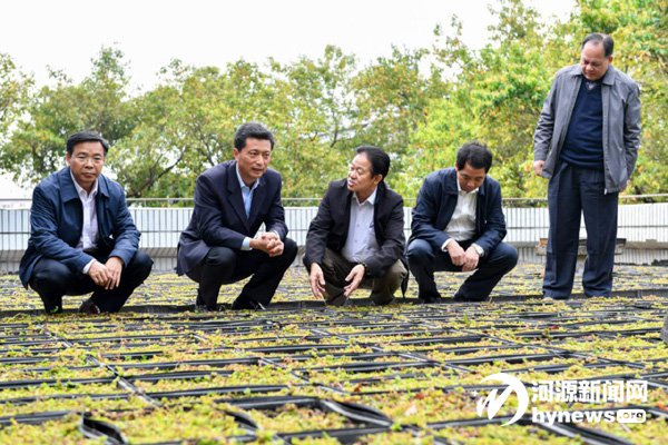 張文(左二)一行在調研市委市政府大院屋頂綠化項目。
