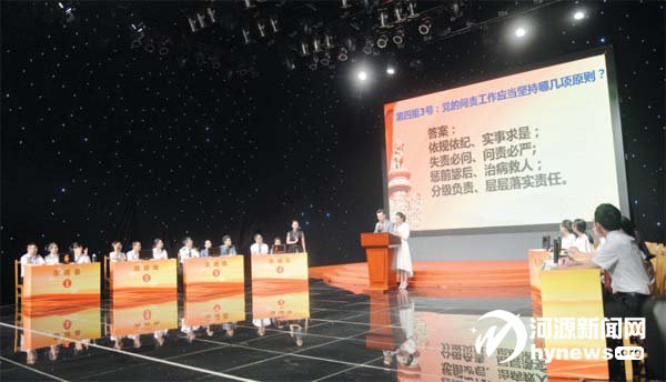 近日,我市第三屆“廉潔火炬杯”黨規黨紀知識競賽落下 帷幕。決賽中,源城區、東源縣、紫金縣,市直政府線、交通線、 農口線、財稅金融線7 支代表隊共21 名選手展開了激烈角 逐。最終,東源縣代表隊獲得一等獎。圖為決賽現場。