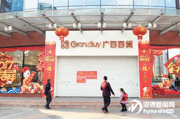 2 月13 日上午10 時許,記者來到位于建設大道的廣百,看到貼在廣百大門上的“溫馨提示”: “ 因內部調整,廣百河源店于 2017 年2 月13 日起暫停營業 ……”當日,除現場工作人員與商家,廣百已禁止市民入內,不少尚未知情廣百即將結業的市民駐足,驚訝地看著廣百貼出來的結業告示。