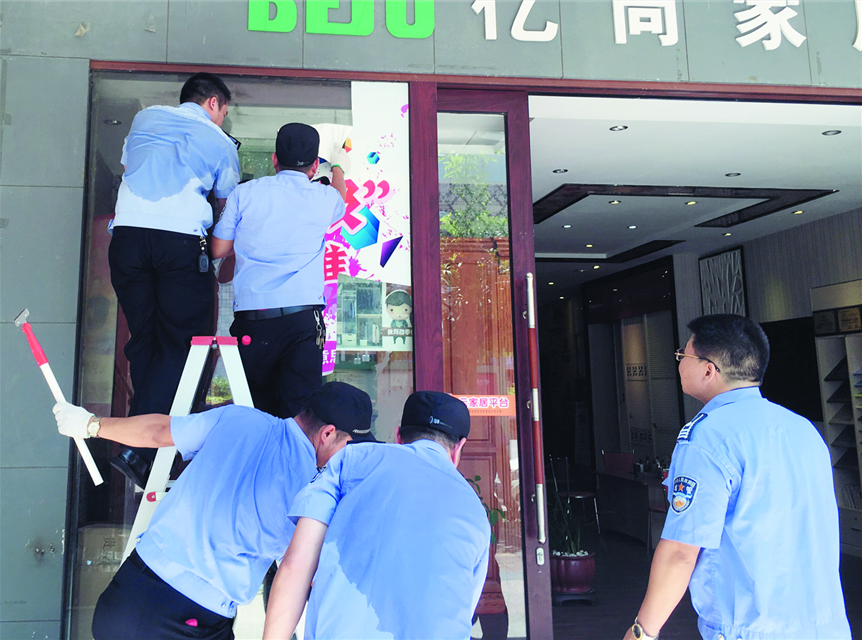 ▲城管人員清理門店 亂貼亂畫,汗流浹背。