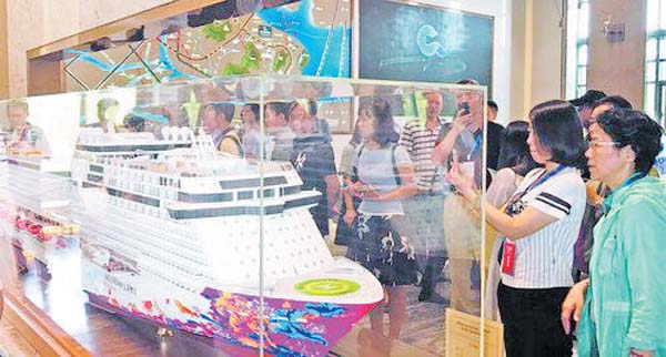 在郵輪文化展示中心,采 訪的老總們考察了正在建設 中的郵輪母港。按照規劃,該 項目將打造成集大型郵輪母 港、航站樓、主題酒店、商務中 心及高端免稅商城于一體的 大型城市綜合體。不過,剛剛 在廣州港南沙三期碼頭,眼尖 的老總們早已發現了停靠著 的麗星郵輪。