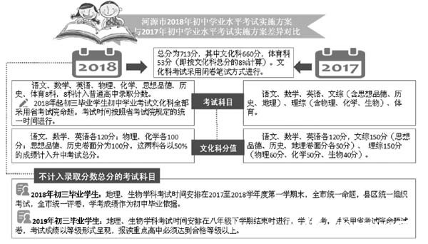 《意見》的出臺,引發我市不 少考生和家長的關注,那么我市 明年的中考政策會不會有很大 的變化呢?記者了解到,我市已 于日前公布了《河源市2018 年初 中學業水平考試實施方案》(以 下簡稱《方案》)!斗桨浮穼ξ沂 2018 年中考的報考資格、報考辦 法和資格審查、考試科目及分值 進行了說明。市教育局相關科 室負責人表示,未來,我市將會 根據國家教育部和廣東省文件 精神,結合本市實際情況,在指 標生分配比例、自主招生等方面 作出調整。