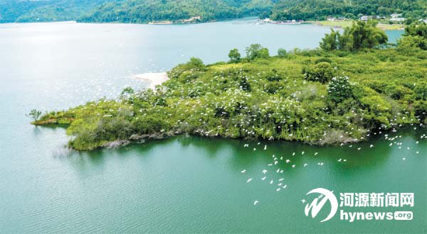 順著萬綠湖環湖公路 盤旋而下,遠眺,高聳的南 山綿延不盡,山青林茂;近 看,溫婉的萬綠湖煙波浩 淼,一碧萬頃。數千只白鷺 結隊而行,飛過山林、湖泊 與村落,翩然起舞,這是東 源縣新回龍鎮東星村秋日 里的一番美景。