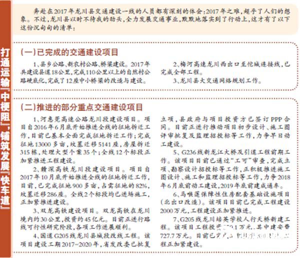 要致富,先修路。交通決定一個地 區與城市的發展格局,交通更決定區域 的前景。科學謀劃,緊緊圍繞“交通強 縣”的戰略部署,以實施重點項目為抓 手,龍川縣全面掀起新一輪交通建設大 會戰熱潮,全力推動通用機場、高鐵、高 速等重大交通項目建設,努力構建連接 粵東北、贛南、湘南、閩西的交通樞紐,促 進龍川跨越振興發展。