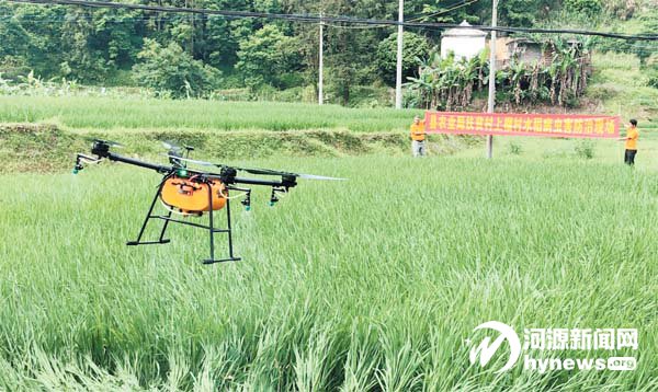 近日,在龍川縣四都鎮上榴村,農技人員正在用兩臺植保無人機對該村的150 畝農田噴藥作業。據了解,該縣參與植 保的鄉鎮有麻布崗、赤光、龍母、四都、登云等8 個鎮,共有兩萬多畝農田使用植保無人機噴灑農藥,以此有效防治水稻病蟲 害的發生。
