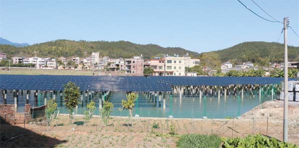 在龍川縣佗城鎮佳派村,1000 千 瓦漁光互補分布式光伏扶貧電站被村 民稱為魚塘上的“印鈔機”。日前,記 者在現場看到,佳派村百壽塘碧波蕩 漾,間或躍出幾尾鯉魚,魚塘里立著數 百根水泥樁,水泥樁上斜放著一面面 明晃晃、亮閃閃的大鏡子。這一面面 鏡子,就是太陽能薄膜電池。而在魚 塘邊的現代化控制室里,不時傳來嗡 嗡的聲音。