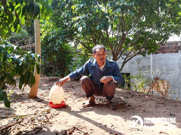 張桂強準備給散養(yǎng)在荔枝園里的土雞添水。