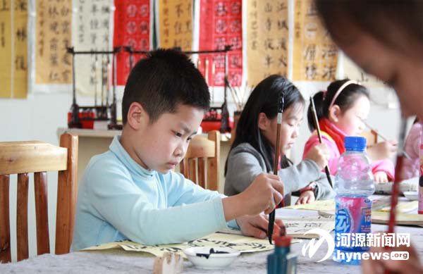 書法興趣小組的學(xué)生在認(rèn)真練字,感受書法魅力。