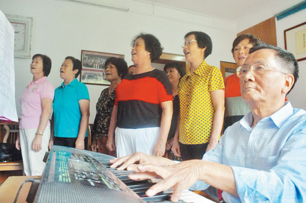 廖育祥(右一)為唱歌愛(ài)好者伴奏。