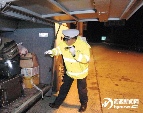 明日就開始進入春運模式。 為保證春運期間交通安全,我市交 警部門啟動6 個春運工作組,13 個 市級春運執勤服務點為過往車輛 和旅客服務。昨日凌晨1 時許,河 源交警支隊高速一大隊四中隊的民 警冒著嚴寒在粵贛高速上陵執勤點 對出省的車輛進行檢查。