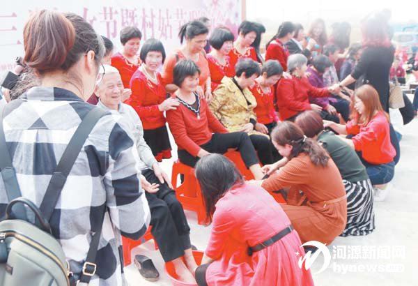 村姑為母親洗腳以表孝心。3 日,為了 傳承孝道文化,同時(shí)也為了迎接第108個(gè)“三 八”國(guó)際勞動(dòng)?jì)D女節(jié),東源縣船塘鎮(zhèn)竹樓村舉 辦了首屆“竹樓村三八婦女節(jié)暨村姑節(jié)聯(lián)歡 會(huì)”,近300名村姑參加了本次聯(lián)歡會(huì)。