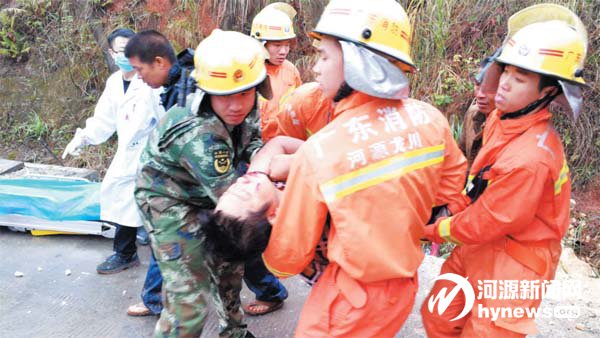 前日上午8 時(shí)許,東源 縣柳城鎮(zhèn)牛背村往河源方 向附近國道發(fā)生了一起交 通事故,一輛裝滿石頭的泥 頭車撞上路邊的坡體,貨車 車頭嚴(yán)重凹陷變形,一名司 機(jī)被困駕駛室。隨后,龍川 縣消防中隊(duì)立即趕往現(xiàn)場 展開救援,通過破拆、擴(kuò)張 等方法,將司機(jī)救出。