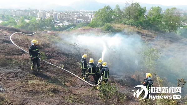 前日15 時02 分,源城 消防中隊接到指揮中心調 度命令稱:桂山路口往高速 方向高壓線著火。源城消 防中隊到達現場后發現,山 坡上的變壓器著火,火苗引 燃了山上的草木,明火大面 積分散在不同的地方。