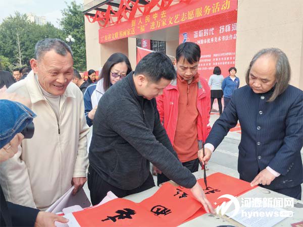 20 日14 時30 分,市美術館前人 頭攢動,廣東“紅色文藝輕騎兵,新春 走基層”送“福”進萬家活動在這里舉 行,來自省書協、市書協的書法家為廣 大市民免費義寫春聯、送“福”字。