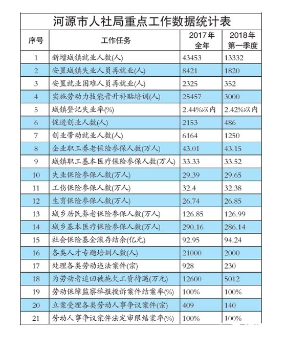 今年,市人社局將緊扣加強(qiáng)黨的建 設(shè)貫穿人社工作始終這“一條主線”,圍 繞市委市政府中心工作,堅(jiān)持以人民為 中心,建好市人力資源服務(wù)產(chǎn)業(yè)園、河 源技師學(xué)院一流校園、機(jī)關(guān)文化學(xué)習(xí) 園、源城和龍川社保經(jīng)辦服務(wù)大廳(園) 等“ 四個(gè)園”,實(shí)現(xiàn)“ 九八五”工作目 標(biāo)。其中,“九”即九個(gè)局黨組成員每 人至少要完成1 項(xiàng)創(chuàng)新亮點(diǎn)工作,在全 國(guó)或全省人社系統(tǒng)會(huì)議作經(jīng)驗(yàn)介紹; “八”即省廳定量考核指標(biāo)中至少要有 八個(gè)以上指標(biāo)完成比例在全省排名前 五或在粵東西北各市排名前二;“五” 即黨的建設(shè)、“三賽”、深化改革、精準(zhǔn) 扶貧、綜合治理(平安建設(shè))工作考核取 得優(yōu)秀等次。