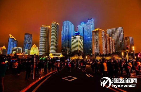 中國山東青島夜景。隨著上合組織青島峰會的臨近,沿海一帶熱門景點的立面燈光秀絢麗奪目。
