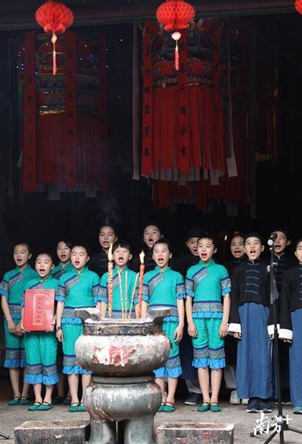 在忠信花燈文化節上,當地孩童在參與家訓文化傳承儀式。 謝鑫 攝