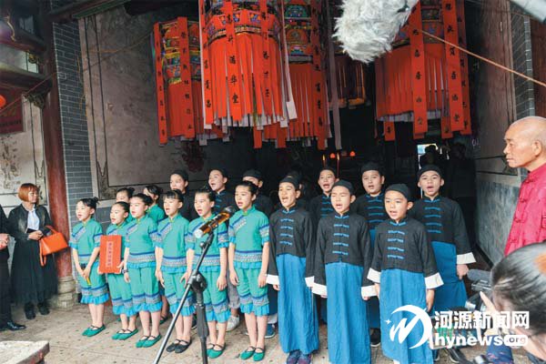 當天,在吳氏祖堂下門前還舉辦了民間客家 鑼鼓演奏。客家鑼鼓即八音鑼鼓,在連平當地多 被稱為連平八音,是連平縣極具特色的一種民間 藝術,也是鄉間慶典活動的重要角色。連平八 音,顧名思義就是由鼓、鑼、鈸、鐺、嗩吶、高胡、 簫、木魚(板眼)組成的民間吹打樂藝術。客家鑼 鼓曲調高昂洪亮,演奏時周而復始,旋律歡快、熱 烈而流暢,讓活動現場沉浸在歡快熱鬧的氣氛 中。據悉,2008年10月,八音鑼鼓被列入河源市 第二批市級非物質文化遺產名錄。